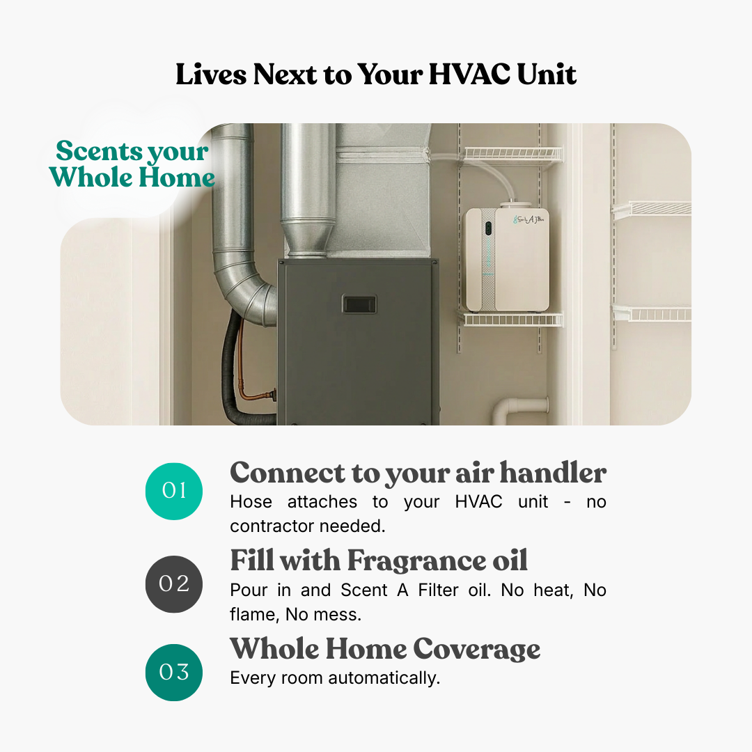 Unlike ultrasonic diffusers that dilute oils with water, our electronic diffuser uses pressurized air to atomize pure fragrance oil into micro-fine particles. A tube installed into your supply duct atomizes the scent directly into your HVAC airflow - delivering stronger, more consistent fragrance with zero residue.